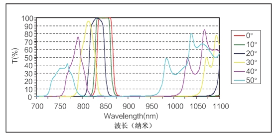 假如入射光線與濾光片的法線夾角有一定的規(guī)模,那么要指明這個夾角的詳細規(guī)模,由于干與濾光片的規(guī)劃對視點十分靈敏,關(guān)于0°下規(guī)劃的窄帶濾光片,假如在不一樣視點下運用,其作用是完全不一樣的。圖2是以850nm窄帶濾光片為例,當(dāng)入射視點增大時,基地波長的方位不斷向短波移動。